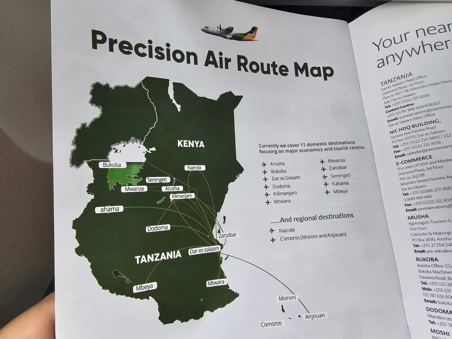 A Precision Air é uma companhia aérea de rede que oferece voos de ligação através dos aeroportos Dar es Salaam DAR ou, Kilimanjaro JRO ou Zanzibar ZNZ.