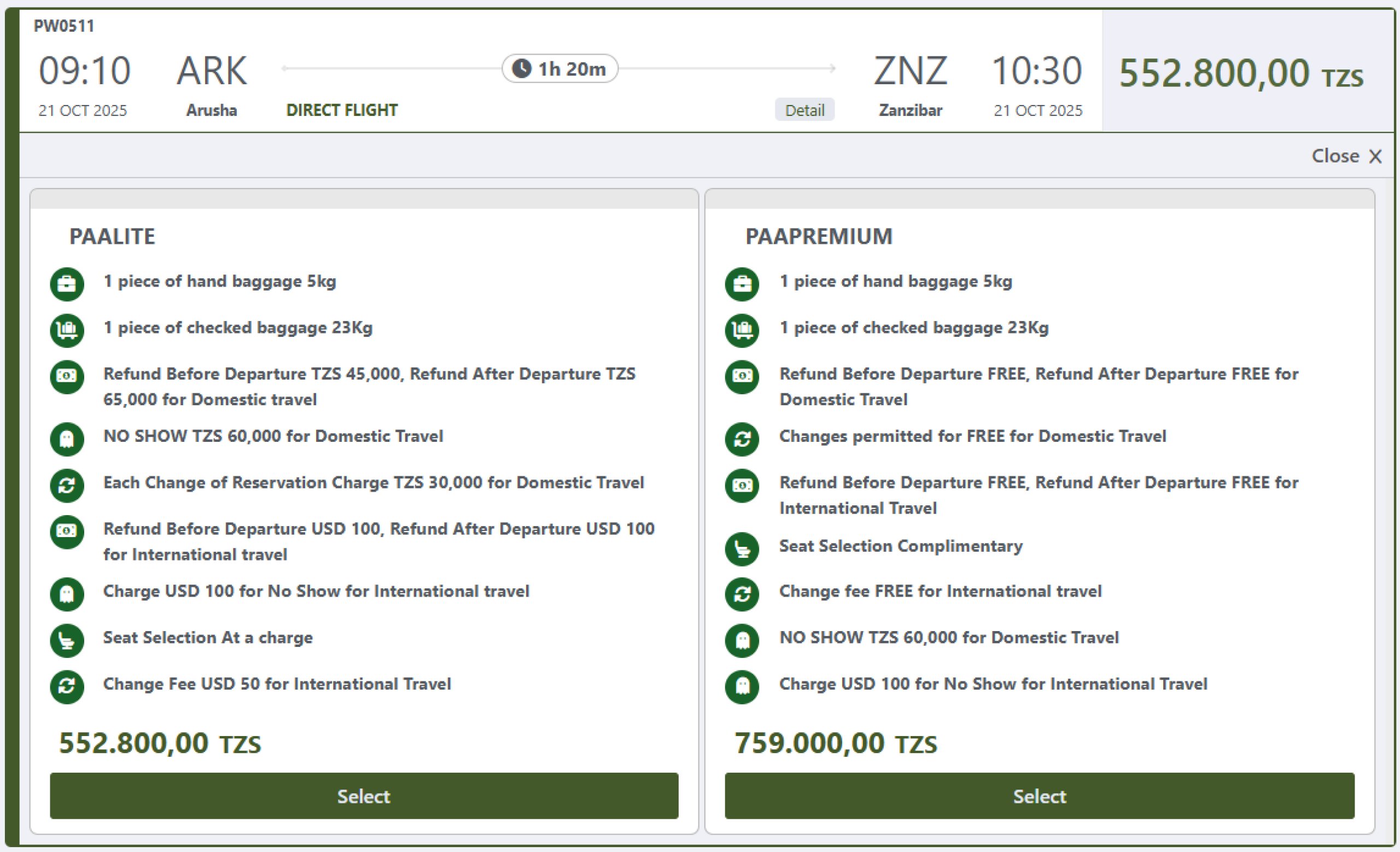 A melhor maneira de comprar bilhetes é diretamente no sítio Web da transportadora precisionairtz.com.