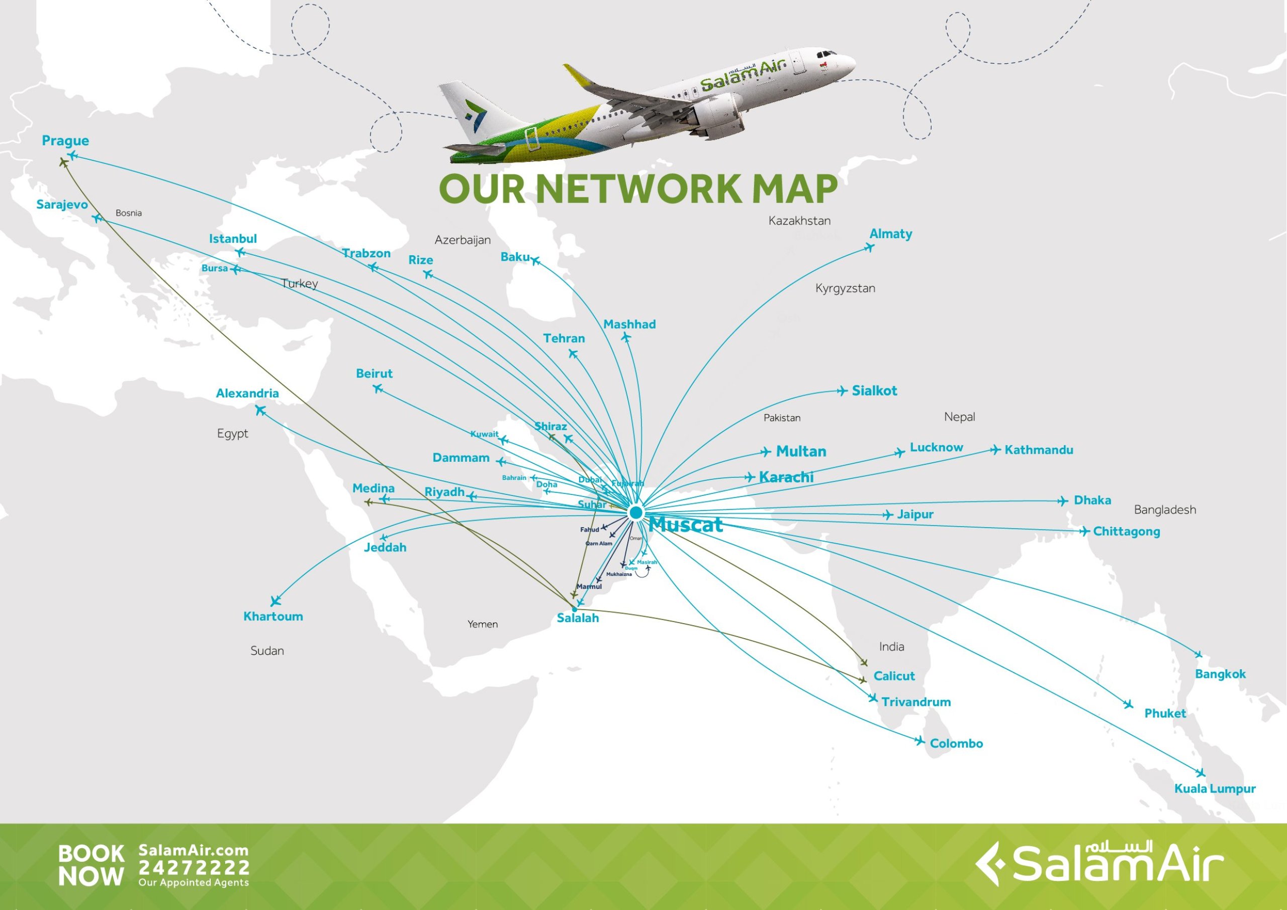 Para obter uma lista clara dos destinos, consulte o mapa de voos da SalamAir em salamair.com/our-network ou a imagem abaixo.