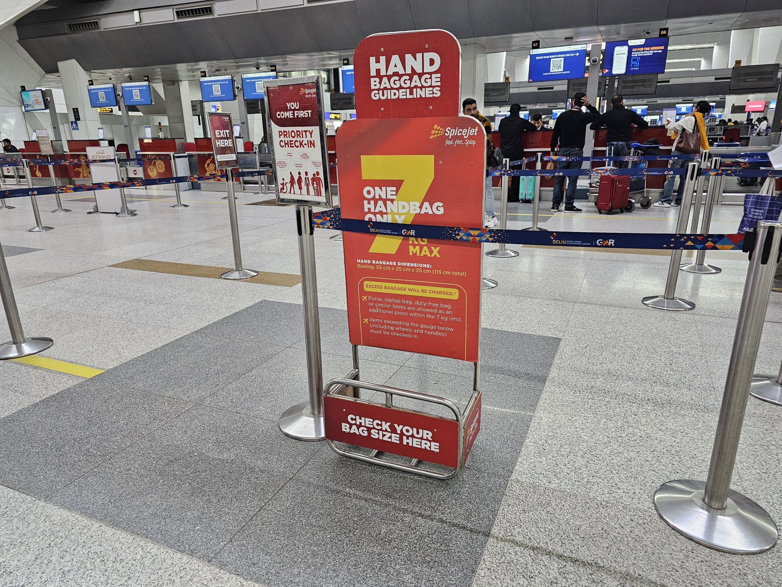 A SpiceJet permite, pelo menos, 1 mala registada até 15 kg (mais para alguns destinos) e uma mala de mão normal de 55 cm x 35 cm x 25 cm até 7 kg gratuitamente em todas as tarifas.